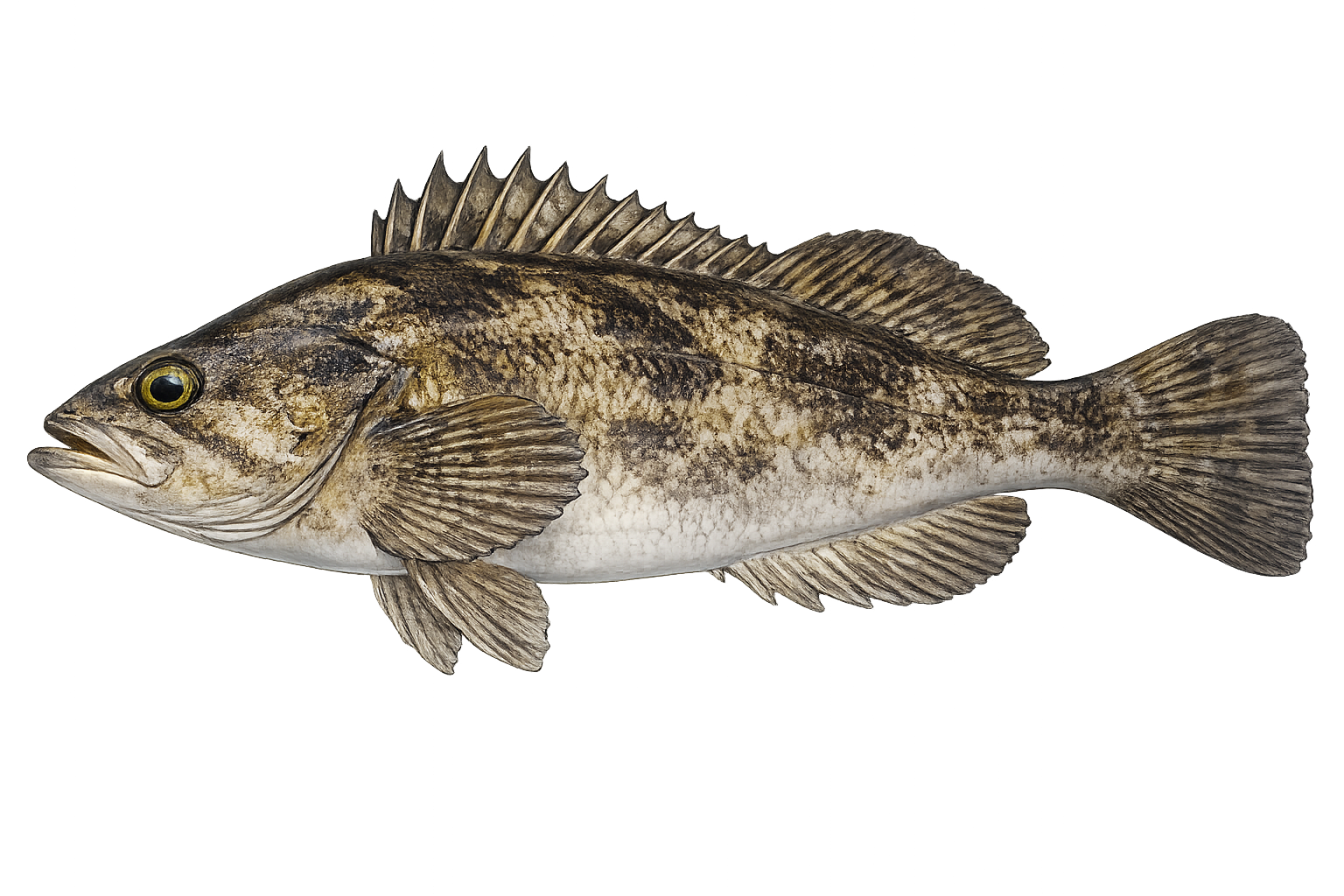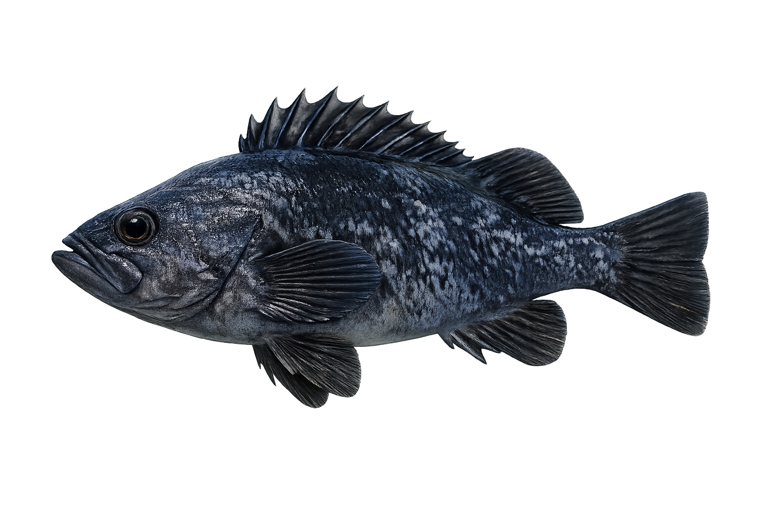 Their coloring is dusky blue-grey with faint mottling. They're a schooling species found from the kelp canopy all the way to 300 ft, which is unusual — most rockfish are depth-specific. FishBase shows a max depth of 550 m and a max weight of 3.8 kg (~8.4 lbs), though you'll rarely see a fish over 2 lbs from a party boat.