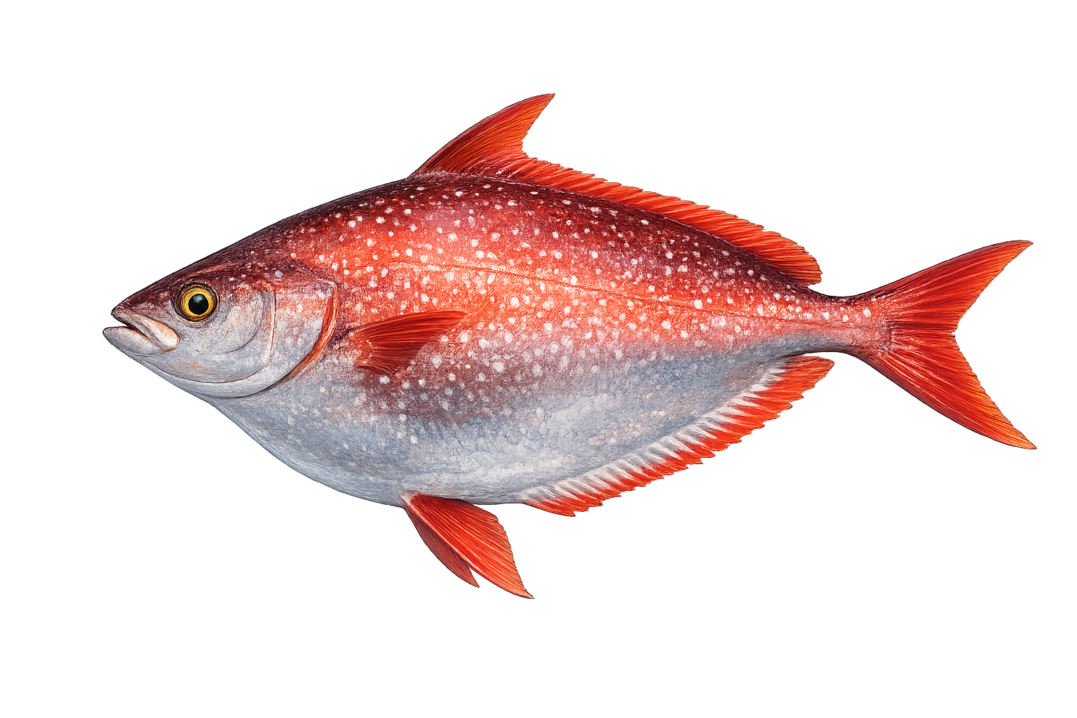 Opah — also called moonfish — are one of the stranger entries in the SoCal offshore catalog. They look wrong: a round, disc-shaped body up to 3 ft in diameter, bright red-orange fins, silver skin covered in white spots. Nothing else in California water looks like them.