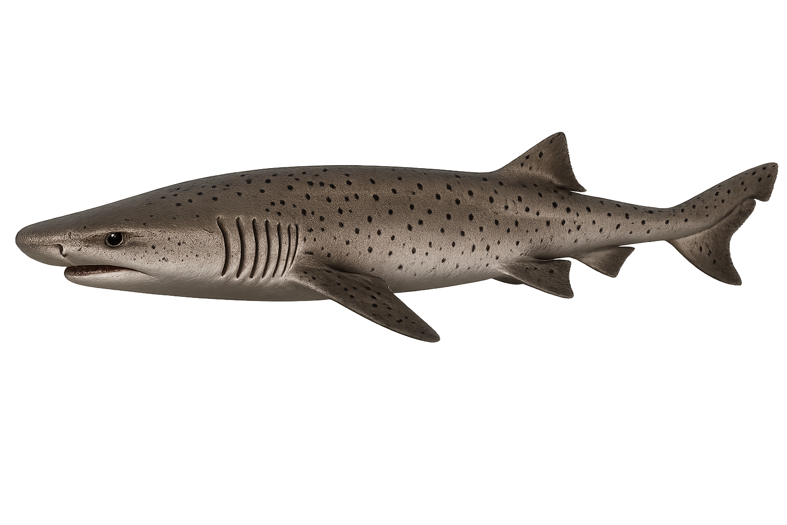 Broadnose sevengill sharks are the most primitive large shark in California waters — members of order Hexanchiformes, a lineage with a fossil record extending back 200 million years. The seven gill slits (most sharks have five) are the obvious field mark; at close range, the broad flat head, single dorsal fin (most sharks have two), and scattered small dark spots on the gray-brown body confirm the ID.
